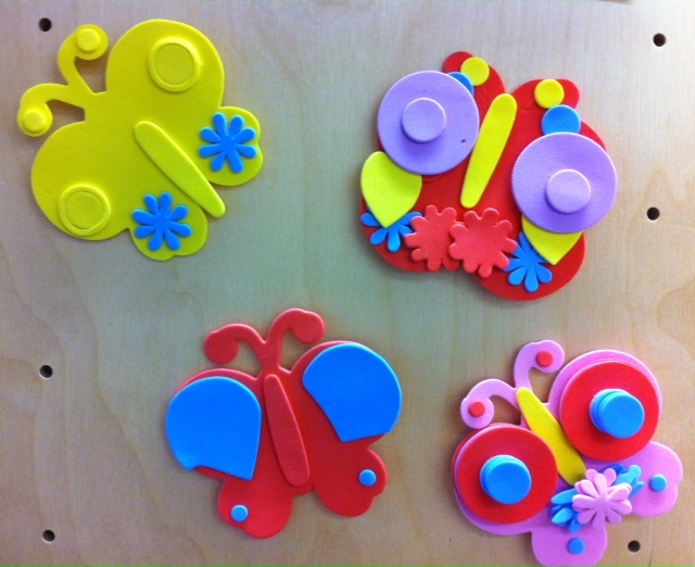 Some easy to use foam butterfly kits from Dollarama have helped us learn more about symmetry, as we have to make sure that one side of our butterfly looks the same as the other side of the butterfly. It's also helping us with our fine motor skills.